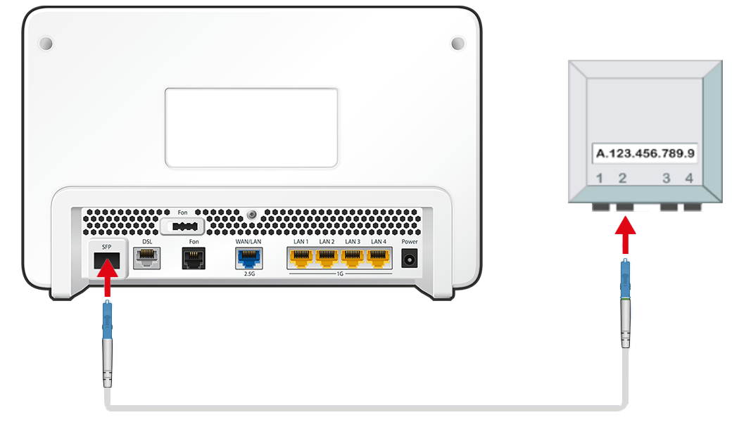 - Schliessen Sie das Glasfaserkabel an das SFP-Modul in der FRITZ!Box und an die Glasfasersteckdose an. Knicken Sie das Glasfaserkabel nicht und halten Sie die Enden des Kabels nicht vor die Augen.